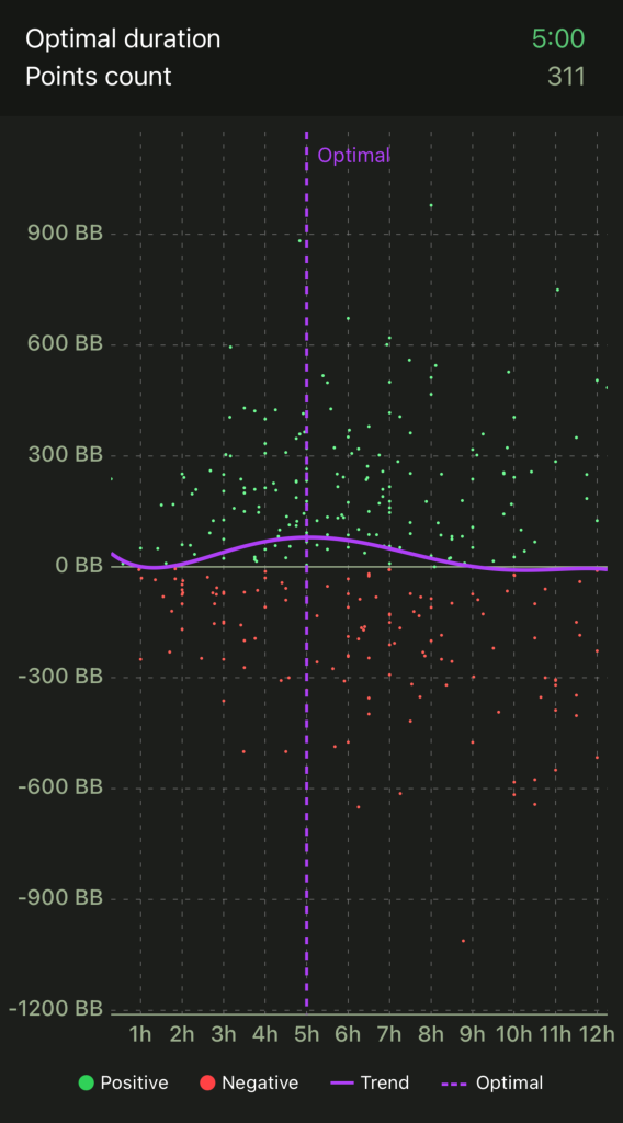 The previous addition has enabled us to refine the algorithm of cash game optimal duration. Entering your stack at various moments during a session will help fine tune data and accentuate drops due to fatigue.
